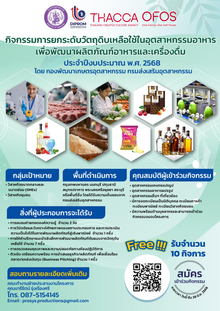 โอกาสดีที่ผู้ประกอบการไม่ควรพลาด! กรมส่งเสริมอุตสาหกรรมเปิดรับสมัครผู้ประกอบการ เข้าร่วมกิจกรรมพัฒนาและยกระดับศักยภาพธุรกิจในกลุ่มอุตสาหกรรมเกษตรแปรรูป อาหารแปรรูป และอุตสาหกรรมที่เกี่ยวข้อง เสริมความรู้ครบวงจรแบบเข้มข้น ทั้งการอบรม การวินิจฉัยธุรกิจ การให้คำปรึกษาเชิงลึกจากผู้เชี่ยวชาญ รวมถึงการเตรียมความพร้อมด้านตลาดและการเงินผ่านกิจกรรม Business Pitching โดยไม่เสียค่าใช้จ่ายใดๆ ทั้งสิ้น! เปิดรับเพียง 10 กิจการเท่านั้น!