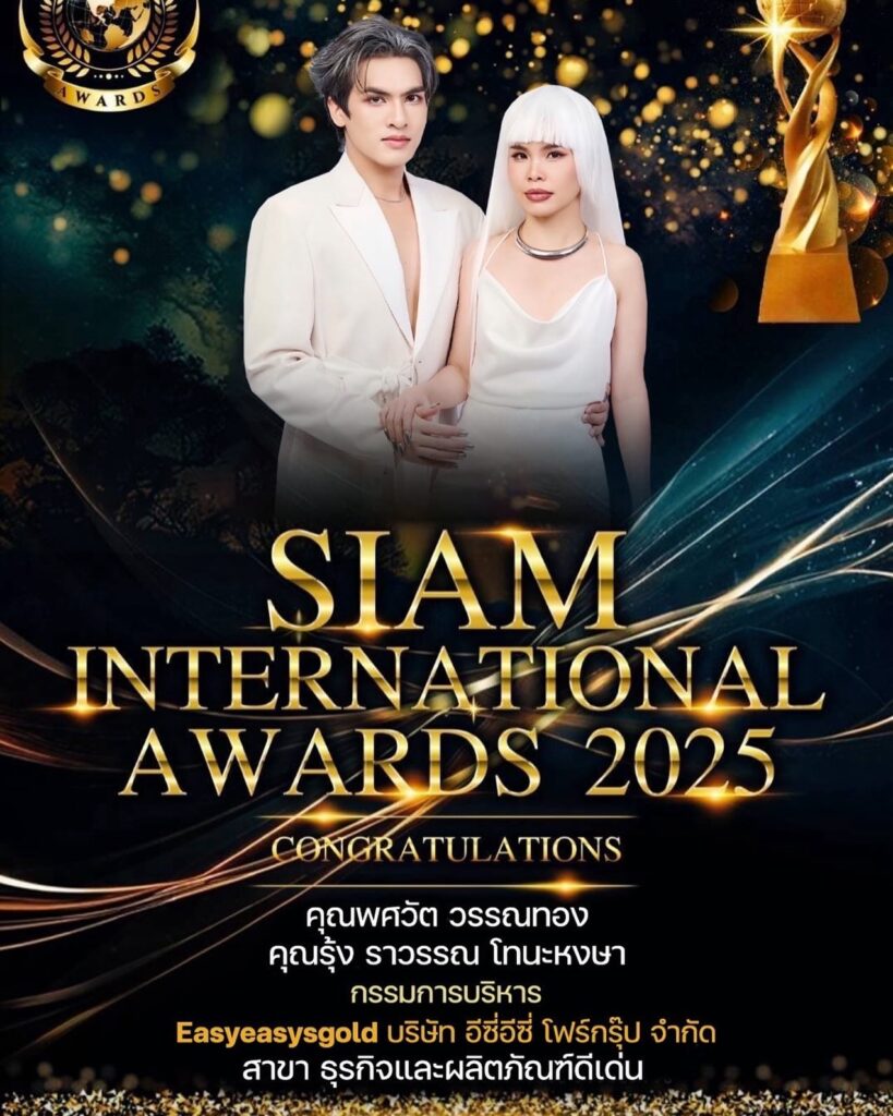 สุดปลื้มกับรางวัลอันทรงเกียรติจากเวที Siam International Awards 2025 ครั้งที่ 3 ที่คนบันเทิง ตบเท้าร่วมเวทีในระดับโลก โดยครั้งนี้พรีเซนเตอร์สาวสุดสวย “รุ้ง ราวรรณ” ควบตำแหน่งผู้ร่วมก่อตั้งแบรนด์ อีซี่อีซี่ โกล์ด (Easy Easys Gold) คว้ารางวัลอันทรงเกียรติ สาขาธุรกิจและผลิตภัณฑ์ดีเด่นประจำปี 2025 ได้สำเร็จ เมื่อต้นเดือนกันยายนที่ผ่านมา