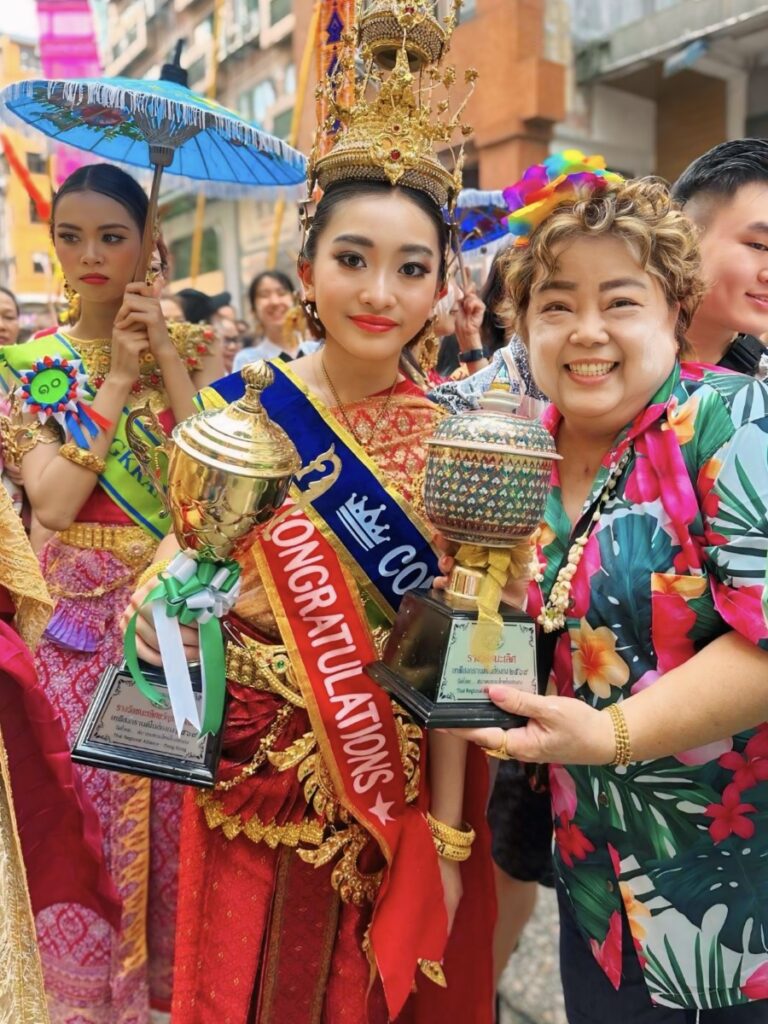 อย่างไรก็ตาม หนึ่งในไฮไลต์สำคัญของงานที่ได้รับความสนใจอย่างมาก คือการประกวด “เทพีสงกรานต์ฮ่องกง 2569” ซึ่งจัดขึ้นโดย สมาคมรวมไทยในฮ่องกง โดยมีผู้เข้าประกวดจากหลากหลายเชื้อชาติและพื้นเพทางวัฒนธรรม สะท้อนถึงความเป็นสังคมโลกที่หลอมรวมความแตกต่างเข้าด้วยกันอย่างลงตัว และผู้ที่สร้างความโดดเด่นและได้รับความสนใจสูงสุด คือ ผู้เข้าประกวดหมายเลข 9 “น้องสายรุ้ง (Rainbow)” เด็กหญิงวัย 13 ปี ลูกครึ่งไทย–ฮ่องกง ซึ่งสามารถคว้ารางวัล ชนะเลิศเทพีสงกรานต์ พร้อมตำแหน่ง ขวัญใจมวลชน จากจำนวนพวงมาลัยที่ได้รับมากที่สุดในงาน สร้างสถิติเป็นผู้คว้ารางวัล “ดับเบิลแชมป์” ในรอบ 26 ปีของการจัดงาน ความสำเร็จของ “น้องสายรุ้ง” ไม่ได้สะท้อนเพียงความสามารถเฉพาะตัว แต่ยังเป็นภาพแทนของเยาวชนไทยในต่างแดนที่สามารถผสมผสานความเป็นสากลเข้ากับรากวัฒนธรรมไทยได้อย่างสมดุล โดยน้องสามารถสื่อสารได้ถึง 4 ภาษา ได้แก่ ภาษาไทย ภาษาอังกฤษ ภาษาจีน และภาษาฝรั่งเศส อีกทั้งยังแสดงออกถึงความอ่อนน้อม มารยาท และความเข้าใจในวัฒนธรรมไทยได้อย่างชัดเจนตลอดการประกวด